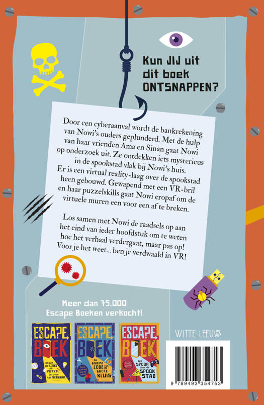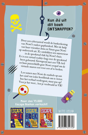 Kun jij uit dit boek ontsnappen? In Escapeboek - Verdwaald in VR van Peter Nilsson wordt de bankrekening van Nowi’s ouders geplunderd door een cyberaanval. Met de hulp van haar vrienden Ama en Sinan gaat Nowi op onderzoek. Ze ontdekken dat er iets mysterieus is in de spookstad vlak bij Nowi’s huis. Er is een virtual reality-laag over de spookstad heen gebouwd. Gewapend met een VR-bril en haar puzzelskills gaat Nowi eropaf om de virtuele muren een voor een af te breken. Puzzel je samen met Nowi een weg door deze virtuele wereld en ontrafel de waarheid!
