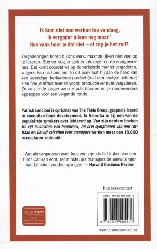 'Ik kom niet aan werken toe vandaag, ik vergader alleen nog maar.' Hoe vaak hoor je dat niet – of zeg je het zelf? Vergaderingen horen bij ons werk, maar ze lijken niet veel op te leveren. Sterker nog, ze gelden als regelrechte energy drains. Dat komt doordat we op de verkeerde manier vergaderen, volgens Patrick Lencioni. In dit boek laat hij aan de hand van een levendige, herkenbare parabel (met een nabespreking) zien hoe je effectiever en vooral productiever kunt vergaderen. Zo kun je de vinger aan de pols houden én je medewerkers oppeppen voor een volgende ronde.