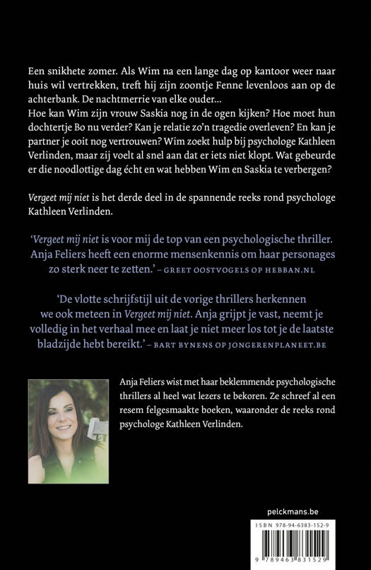 Een snikhete zomer. Als Wim na een lange dag op kantoor weer naar huis wil vertrekken, treft hij zijn zoontje Fenne levenloos aan op de achterbank. De nachtmerrie van elke ouder... Hoe kan Wim zijn vrouw Saskia nog in de ogen kijken? Hoe moet hun dochtertje Bo nu verder? Kan je relatie zo'n tragedie overleven? En kan je partner je ooit nog vertrouwen? Wim zoekt hulp bij psychologe Kathleen Verlinden, maar zij voelt al snel aan dat er iets niet klopt. Wat gebeurde er die noodlottige dag écht en wat hebben Wim en Saskia te verbergen? Vergeet mij niet is het derde deel in de spannende reeks rond psychologe Kathleen Verlinden.