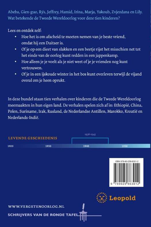In deze bundel staan tien verhalen over kinderen die de Tweede Wereldoorlog meemaakten in hun eigen land. De verhalen spelen zich af in: Ethiopië, China, Polen, Suriname, Irak, Rusland, de Nederlandse Antillen, Marokko, Kroatië en Nederlands-Indië.