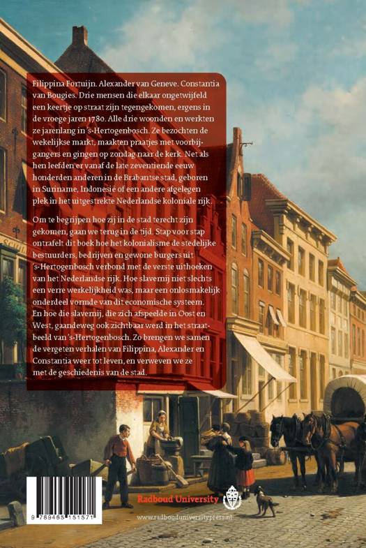 Om te begrijpen hoe zij in de stad terecht zijn gekomen, gaan we terug in de tijd. Stap voor stap ontrafelt dit boek hoe het kolonialisme de stedelijke bestuurders, bedrijven en gewone burgers uit ’s-Hertogenbosch verbond met de verste uithoeken van het Nederlandse rijk. Hoe slavernij niet slechts een verre werkelijkheid was, maar een onlosmakelijk onderdeel vormde van dit economische systeem. En hoe die slavernij, die zich afspeelde in Oost en West, gaandeweg ook zichtbaar werd in het straatbeeld van ’s-Hertogenbosch. Zo brengen we samen de vergeten verhalen van Filippina, Alexander en Constantia weer tot leven, en verweven we ze met de geschiedenis van de stad.