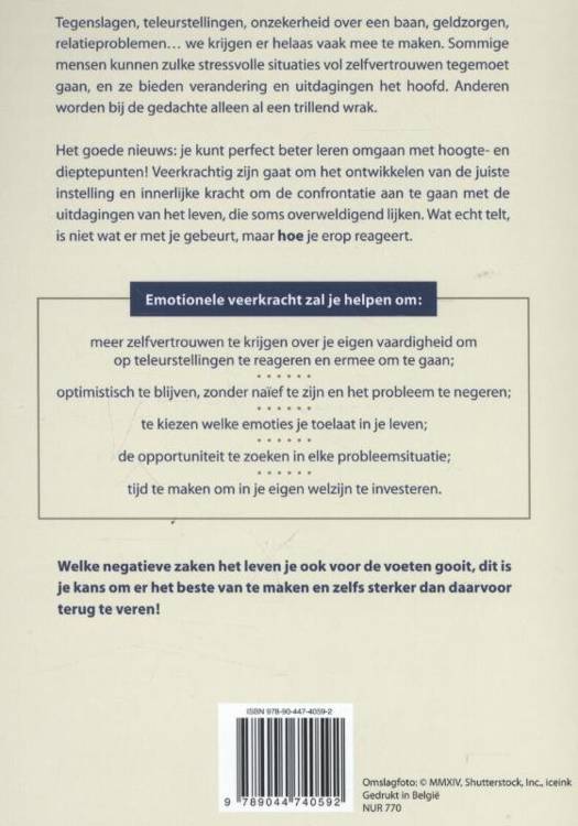 Tegenslagen, teleurstellingen, onzekerheid over een baan, geldzorgen, relatieproblemen… we krijgen er helaas vaak mee te maken. Sommige mensen kunnen zulke stressvolle situaties vol zelfvertrouwen tegemoet gaan, en ze bieden verandering en uitdagingen het hoofd. Anderen worden bij de gedachte alleen al een trillend wrak. Het goede nieuws: je kunt perfect beter leren omgaan met hoogte- en dieptepunten! Veerkrachtig zijn gaat om het ontwikkelen van de juiste instelling en innerlijke kracht om de confrontatie aan te gaan met de uitdagingen van het leven, die soms overweldigend lijken. Wat echt telt, is niet wat er met je gebeurt, maar hoe je erop reageert. Emotionele veerkracht zal je helpen om: - meer zelfvertrouwen te krijgen over je eigen vaardigheid om op teleurstellingen te reageren en ermee om te gaan; - optimistisch te blijven, zonder naïef te zijn en het probleem te negeren; - te kiezen welke emoties je toelaat in je leven; - de opportuniteit te zoeken in elke probleemsituatie; - tijd te maken om in je eigen welzijn te investeren. Welke negatieve zaken het leven je ook voor de voeten gooit, dit is je kans om er het beste van te maken en zelfs sterker dan daarvoor terug te veren!
