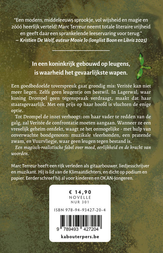 In een koninkrijk gebouwd op leugens, is waarheid het gevaarlijkste wapen. Een goedbedoelde toverspreuk gaat grondig mis: Veritée kan niet meer liegen. Zelfs geen leugentje om bestwil. In Lagerwal, waar koning Drompel geen tegenspraak verdraagt, maakt dat haar staatsgevaarlijk. Met een prijs op haar hoofd is vluchten de enige optie. Tot Drompel de inzet verhoogt: om haar vader te redden van de galg, zal Veritée de confrontatie moeten aangaan. Wanneer ze een vreselijk geheim ontdekt, waagt ze het onmogelijke - met hulp van onverwachte bondgenoten: muzikale vleerhonden, een pratende zwam, en Vuurvliegje, waar geen leugen tegen bestand is. Een magisch-realistische fabel over moed, eerlijkheid en de kracht van woorden.