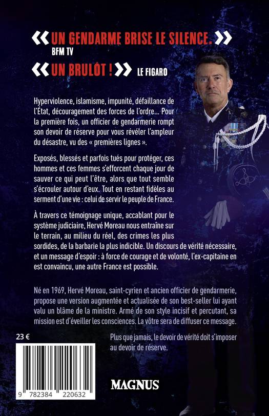 Hyperviolence, islamisme, impunité, défaillance de l'État, découragement des forces de l'ordre... Pour la première fois, un officier de gendarmerie rompt son devoir de réserve pour vous révéler l'ampleur du désastre, vu des « premières lignes ». Exposés, blessés et parfois tués pour protéger, ces hommes et ces femmes s'efforcent chaque jour de sauver ce qui peut l'être, alors que tout semble s'écrouler autour d'eux, tout en restant fidèles au serment d'une vie : celui de servir le peuple de France. À travers ce témoignage unique, accablant pour le système judiciaire, Hervé Moreau nous entraîne sur le terrain, au milieu du réel, des crimes les plus sordides, de la barbarie la plus indicible. Un discours de vérité nécessaire, et un message d'espoir : à force de courage et de volonté, l'ex-capitaine en est convaincu, une autre France est possible. Né en 1969, Hervé Moreau, saint-cyrien et ancien officier de gendarmerie, propose une version augmentée et actualisée de son best-seller lui ayant valu un blâme de la ministre. Armé de son style incisif et percutant, sa mission est d'éveiller les consciences. La vôtre sera de diffuser ce message. Plus que jamais, le devoir de vérité doit s'imposer au devoir de réserve.
