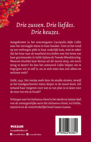 Verlangen naar het Italiaanse eiland is het derde en laatste deel van de onvergetelijke serie Het Italiaanse eiland. Vol liefde, mysterie en de onverbrekelijke band tussen zussen. Voor lezers van Kristin Hannah en Lucinda Riley.
