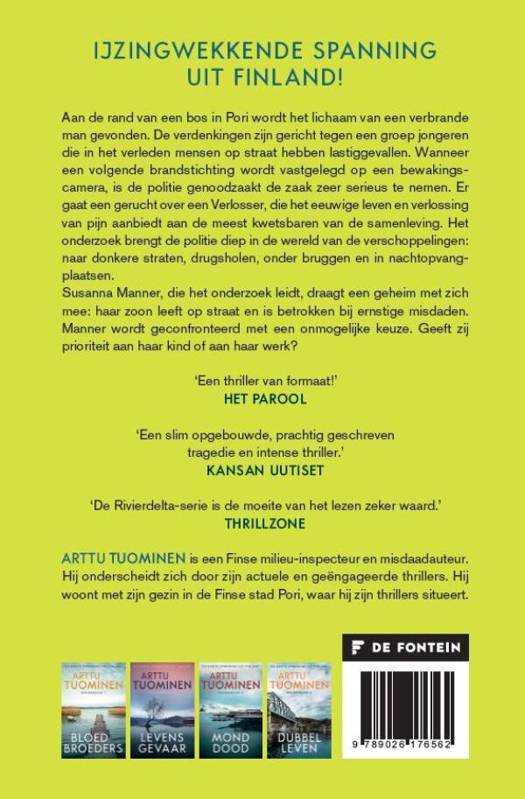 Deel 5 in de serie Rivierdelta. Het lichaam van een verbrande man wordt gevonden op de atletiekbaan in Pori. Het slachtoffer werd overgoten met benzine en in brand gestoken. De verdenkingen zijn gericht tegen een groep jongeren waarvan bekend is dat zij in het verleden mensen die op straat leven hebben lastiggevallen. Het vermoeden bestaat dat het pesten enorm uit de hand is gelopen. Wanneer een volgende brandstichting wordt vastgelegd op een bewakingscamera, is de politie genoodzaakt de zaak zeer serieus te nemen. Er gaat een gerucht op straat over een Verlosser die eeuwig leven en verlossing van pijn aanbiedt aan de meest kwetsbaren van de samenleving. Het onderzoek voert de politie diep in de wereld van de verschoppelingen: naar nachtelijke straten, drugsholen, onder bruggen en nachtopvangplaatsen. Susanna Manner, die het onderzoek leidt, heeft een geheim: haar zoon is een straatbewoner en betrokken bij ernstige misdaden. Manner wordt geconfronteerd met een onmogelijke keuze: geeft zij prioriteit aan haar kinderen of aan haar werk?