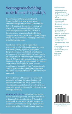 De bundel bestaat uit bijdragen van verschillende auteurs die werkzaam zijn binnen het financiële recht en die specialist zijn op het gebied van de vermogensscheiding. Iedere auteur geeft vanuit zijn eigen achtergrond invulling aan het onderwerp van de vermogensscheiding.