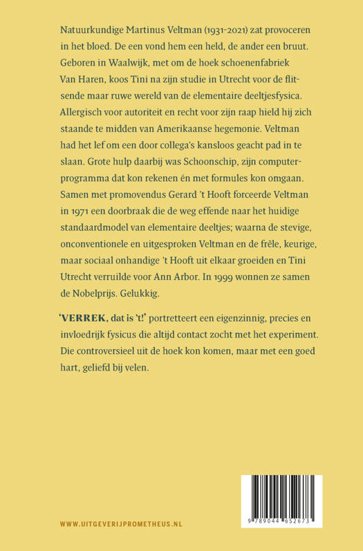 Natuurkundige Martinus Veltman (1931-2021) zat provoceren in het bloed. De een vond hem een held, de ander een bruut. Geboren in Waalwijk, met om de hoek schoenenfabriek Van Haren, koos Tini na zijn studie in Utrecht voor de flitsende maar ruwe wereld van de elementaire deeltjesfysica. Allergisch voor autoriteit en recht voor zijn raap hield hij zich staande te midden van Amerikaanse hegemonie. Veltman had het lef om een door collega’s kansloos geacht pad in te slaan. Grote hulp daarbij was Schoonschip, zijn computerprogramma dat kon rekenen én met formules kon omgaan. Samen met promovendus Gerard ’t Hooft forceerde Veltman in 1971 een doorbraak die de weg effende naar het huidige standaardmodel van elementaire deeltjes; waarna de stevige, onconventionele en uitgesproken Veltman en de frêle, keurige maar sociaal onhandige ’t Hooft uit elkaar groeiden en Tini Utrecht verruilde voor Ann Arbor. In 1999 wonnen ze samen de Nobelprijs. Gelukkig.