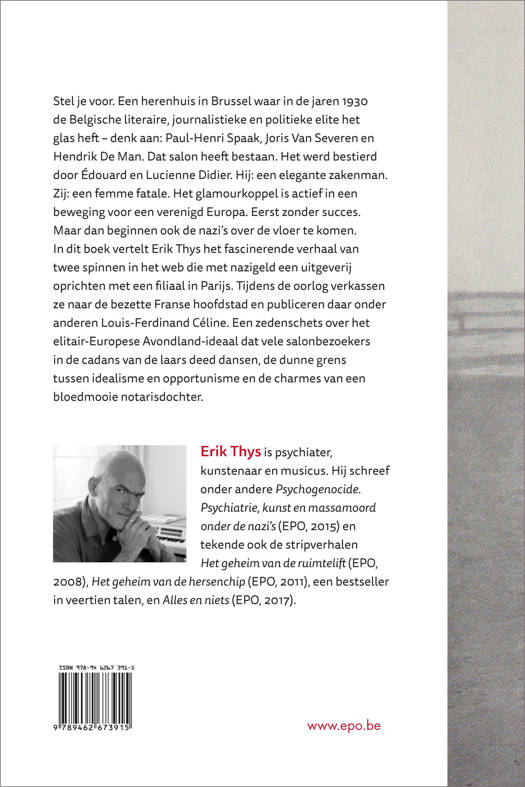 In dit boek vertelt Erik Thys het fascinerende verhaal van twee spinnen in het web die later in de oorlog naar Parijs verkassen. Daar richten ze met nazigeld een uitgeverij op die onder anderen Louis-Ferdinand Céline publiceert. Een zedenschets over het elitair- Europese Avondland-ideaal dat vele salonbezoekers in de cadans van de laars deed dansen, de dunne grens tussen idealisme en opportunisme en de charmes van een bloedmooie notarisdochter.