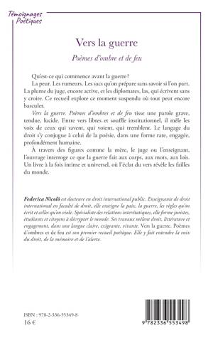 Qu'est-ce qui commence avant la guerre ? La peur. Les rumeurs. Les sacs qu'on prépare sans savoir si l'on part. La plume du juge, encore active, et les diplomates, las, qui écrivent sans y croire. Ce recueil explore ce moment suspendu où tout peut encore basculer. Vers la guerre. Poèmes d'ombres et de feu tisse une parole grave, tendue, lucide. Entre vers libres et souffle institutionnel, il mêle les voix de ceux qui savent, qui voient, qui tremblent. Le langage du droit s'y conjugue à celui de la poésie, dans une forme rare, engagée, profondément humaine. À travers des figures comme la mère, le juge ou l'enseignant, l'ouvrage interroge ce que la guerre fait aux corps, aux mots, aux lois. Un livre à la fois intime et universel, où l'éclat du vers révèle les failles du monde.