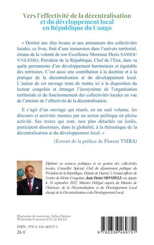 Destiné aux élus locaux et aux animateurs des collectivités locales, ce livre, fruit d'une immersion dans l'univers territorial, émane de la volonté de son Excellence Monsieur Denis SASSOU N'GUESSO, Président de la République, Chef de l'Etat, dans sa quête permanente d'un développement harmonieux et équitable des territoires. C'est aussi une contribution à la doctrine et à la pratique de la décentralisation et du développement local. L'auteur de cet ouvrage tente de mettre ici à la disposition du lecteur congolais et étranger l'écosystème de l'organisation territoriale et du fonctionnement des collectivités locales en vue de l'atteinte de l'effectivité de la décentralisation. Il s'agit d'un ouvrage qui réunit, en un seul volume, les discours et activités menées par un acteur politique en pleine activité. Ses textes qui sont, non plus détachés ou isolés, participent désormais, dans la globalité, à la thématique de la décentralisation et du développement local. (Extrait de la préface de Florent TSIBA)