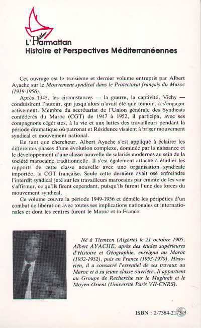 Cet ouvrage est le troisième et dernier volume entrepris par Albert Ayache sur le Mouvement syndical dans le Protectorat français du Maroc (1919-1956). Après 1943, les circonstances - la guerre, la captivité. Vichy - conduisirent l'auteur, qui jusqu'alors n'avait été que témoin, à s'engager activement. Membre du secrétariat de l'Union générale des Syndicats confédérés du Maroc (CGT) de 1947 à 1952, il participa, avec ses compagnons cégétistes, à la vie et aux luttes des travailleurs pendant la période dramatique où patronat et Résidence visaient à briser mouvement syndical et mouvement national. En tant que chercheur, Albert Ayache s'est appliqué à éclairer les différentes phases d'une évolution complexe, dominée par la naissance et le développement d'une classe nouvelle de salariés modernes au sein de la société marocaine traditionnelle. Il s'est également attaché à étudier les rapports de cette classe nouvelle avec une organisation syndicale importée, la CGT française. Seule cette dernière avait osé enfreindre l'interdit syndical jeté sur les travailleurs marocains par crainte de les voir s'affirmer, ce qu'ils firent cependant, puisqu'ils furent l'une des forces du mouvement syndical. Ce volume couvre la période 1949-1956 et démêle les péripéties d'un combat de libération avec toutes ses implications nationales et internationales et dont les centres furent le Maroc et la France.