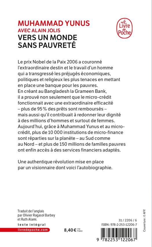 Le prix Nobel de la Paix 2006 a couronné l’extraordinaire destin et le travail d’un homme qui a transgressé les préjugés conomiques, politiques et religieux les plus tenaces en mettant en place une banque pour les pauvres. En créant au Bangladesh la Grameen Bank, il a prouvé non seulement que le micro-crédit fonctionnait avec une extraordinaire efficacité – plus de 95% des prêts sont remboursés – mais aussi qu’il contribuait à redonner leur dignité à des millions d’hommes et surtout de femmes. Aujourd’hui, grâce à Muhammad Yunus et au micro-crédit, plus de 10 000 institutions de micro-finance sont réparties sur la planète – au Sud comme au Nord – et plus de 150 millions de familles pauvres ont enfin accès à des services financiers adaptés.