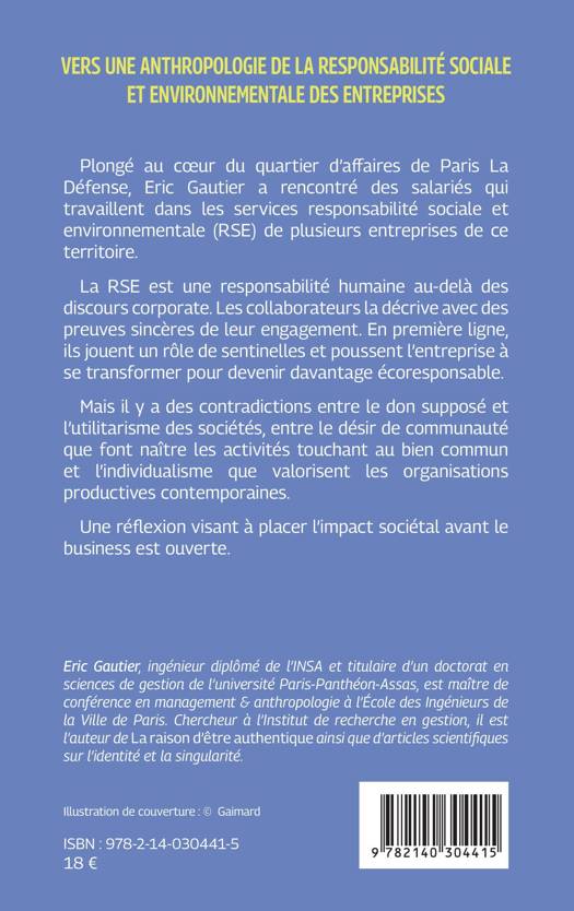 Plongé au cur du quartier d'affaires de Paris La Défense, Eric Gautier a rencontré des salariés qui travaillent dans les services responsabilité sociale et environnementale (RSE) de plusieurs entreprises de ce territoire. La RSE est une responsabilité humaine au-delà des discours corporate. Les collaborateurs la décrivent avec des preuves sincères de leur engagement. En première ligne, ils jouent un rôle de sentinelles et poussent l'entreprise à se transformer pour devenir davantage écoresponsable. Mais il y a des contradictions entre le don supposé et l'utilitarisme des sociétés, entre le désir de communauté que font naître les activités touchant au bien commun et l'individualisme que valorisent les organisations productives contemporaines. Une réflexion visant à placer l'impact sociétal avant le business est ouverte.