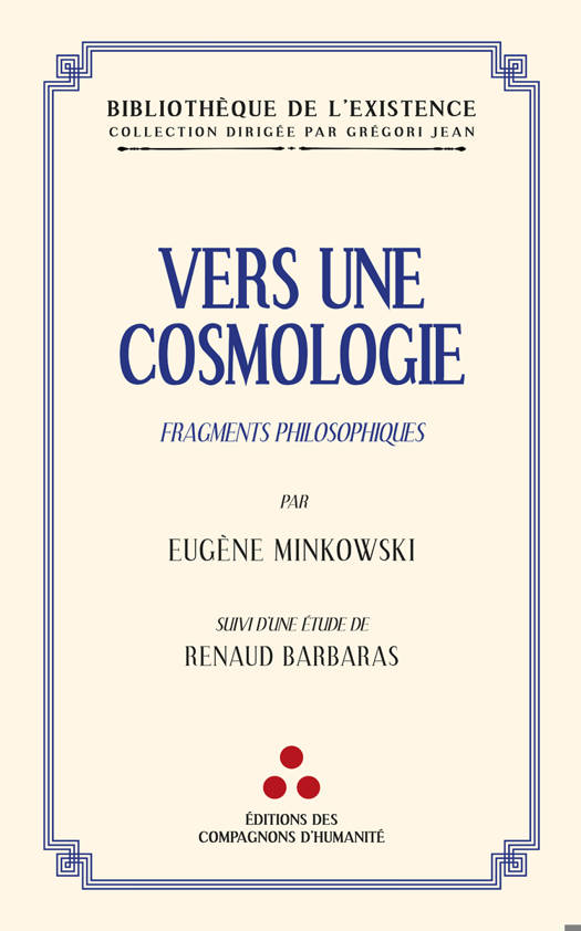 Au fil des 24 fragments qui composent Vers une cosmologie, Eugène Minkowski nous invite à un voyage philosophique pour le moins frappant. Ces textes, datant pourtant de 1936, ne sont pas sans faire écho au présent tant ils nous plongent au cœur d’une expérience vivant et vitale. À une époque où l’humain disparaît et se voir réduit par diverses entreprises, la cosmologie d’Eugène Minkowski apparait comme un véritable souffle faisant droit à l’immédiateté du contact vital avec la réalité. Nous sommes ainsi conduit, tout au long de cet ouvrage, dans une longue quête qui n’est autre que celle du sens de la vie et dont le chemin semble conduire vers une cosmologie : « La science dissèque, oppose, procède par abstractions, généralise. À son contact la vie s’immobilise, file entre ses doigts. La science ne peut concevoir qu’un seul mouvement : le déplacement des corps dans l’espace, et ce mouvement elle le décompose encore en positions successives et le traduit par des courbes, par du statique. De tout ce à quoi elle touche elle fait de l’immobile, de la nature morte. Pourtant tout autour de nous le monde retentit de mille mélodies, exhale mille parfums, s’anime de mille mouvements qui font tressaillir et palpiter tout notre être, et nous participons à cette vie, si intense, si nuancée, encore qu’impalpable. C’est cette vie, à laquelle nous venons puiser nos forces et notre raison d’être, que nous voudrions aussi connaître, en cherchant à saisir sur le vif, à discerner, à différencier les divers mouvements, les qualités dynamiques dont elle se compose, pour étudier ensuite leurs affinités particulières, les enchaînements auxquels ils donnent lieu. C’est là le but que poursuit la cosmologie. Ayant pour objet les mouvements communs à l’âme humaine et à la nature, (…) elle ne peut qu’animer tout ce à quoi elle touche. Même toute « nature morte » devient vivante à son contact, nous révèle le sens de la vie, de l’homme, du cosmos. » (E. Minkowski)
