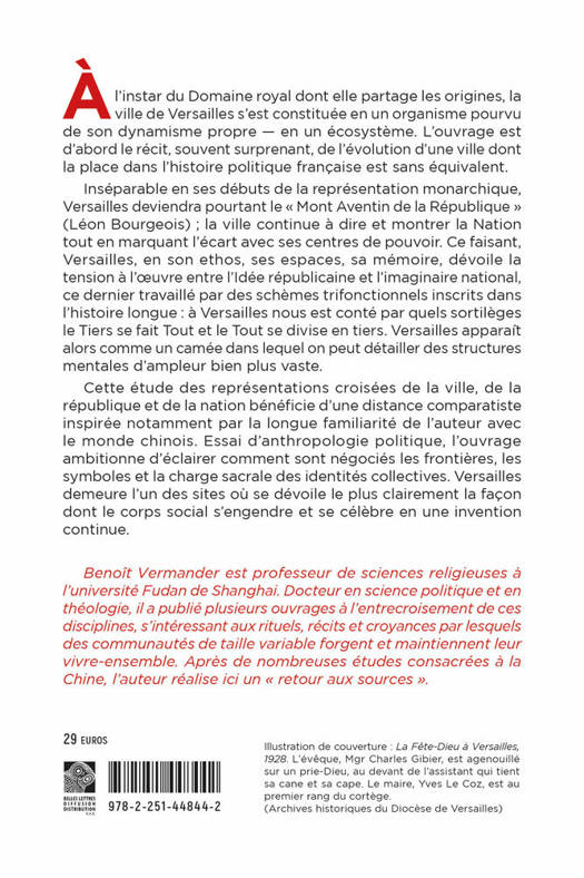 A l'instar du Domaine royal dont elle partage les origines, la ville de Versailles s'est constituee en un organisme pourvu de son dynamisme propre - en un ecosysteme. L'ouvrage est d'abord le recit, souvent surprenant, de l'evolution d'une ville dont la place dans l'histoire politique francaise est sans equivalent. Inseparable en ses debuts de la representation monarchique, Versailles deviendra pourtant le Mont Aventin de la Republique (Leon Bourgeois); la ville continue a dire et montrer la Nation tout en marquant l'ecart avec ses centres de pouvoir. Ce faisant, Versailles, en son ethos, ses espaces, sa memoire, devoile la tension a l'oeuvre entre l'Idee republicaine et l'imaginaire national, ce dernier travaille par des schemes trifonctionnels inscrits dans l'histoire longue: a Versailles nous est conte par quels sortileges le Tiers se fait Tout et le Tout se divise en tiers. Versailles apparait alors comme un camee dans lequel on peut detailler des structures mentales d'ampleur bien plus vaste. Cette etude des representations croisees de la ville, de la republique et de la nation beneficie d'une distance comparatiste inspiree notamment par la longue familiarite de l'auteur avec le monde chinois. Essai d'anthropologie politique, l'ouvrage ambitionne d'eclairer comment sont negocies les frontieres, les symboles et la charge sacrale des identites collectives. Versailles demeure l'un des sites ou se devoile le plus clairement la facon dont le corps social s'engendre et se celebre en une invention continue.