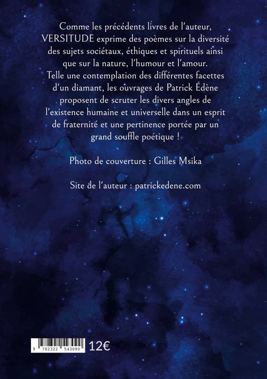 Comme les précédents livres de l'auteur, VERSITUDE exprime des poèmes sur la diversité des sujets sociétaux, éthiques et spirituels ainsi que sur la nature, l'humour et l'amour. Telle une contemplation des différentes facettes d'un diamant, les ouvrages de Patrick Édène proposent de scruter les divers angles de l'existence humaine et universelle dans un esprit de fraternité et une pertinence portée par un grand souffle poétique !