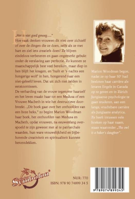 Het is niet goed genoeg Hoe vaak denken vrouwen dit niet over zichzelf of over de dingen die ze doen, zelfs als ze met hart en ziel iets creatiefs doen! Ze blijven eindeloos verbeteren en lijden ongemerkt aan de verslaving aan perfectie. Zo kunnen ze maatschappelijk best veel bereiken, maar diep in hen blijft het knagen, en huilt er s nachts een hongerige wolf in hen, hongerend naar een niet-geleefd leven. De verharding van de vrouw naar haarzelf en naar het leven maakt haar tot een Medusa of een Macbeth waarin het destructieve doorbreekt. Dit boek gaat over het onthoofden van een boze heks zo begint Marion Woodman haar boek, het onthoofden van Medusa en Macbeth, opdat vrouwen hun ware vrouwelijkheid en bijbehorende creativiteit en spiritualiteit kunnen herontdekken, na eeuwenlang overspoeld te zijn geweest met al te patriarchale waarden.
