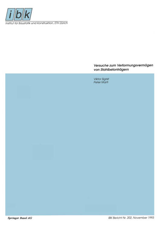 Die hier beschriebenen Versuche wurden im Rahmen der ersten Phase des von mir gelei- teten Forschungsprojekts "Verformungsvermogen von Massivbautragwerken" durchge- fiihrt. Die Interpretation der Versuchsergebnisse, ein Vergleich mit Resultaten friiherer Versuche und erganzende theoretische Untersuchungen werden von Herrn Sigrist zur Zeit vorgenommen. Die Ergebnisse dieser Arbeiten sollen in etwa einem Jahr vorliegen und in Form einer Dissertation veroffentlicht werden. Die friiher iibliche separate Numerierung von Versuchsberichten des Instituts fUr Baustatik und Konstruktion der ETH Ziirich wird mit dem vorliegenden Bericht aufge- geben; neu werden Versuchsberichte in die fortlaufend numerierte Reihe der iibrigen Berichte unseres Instituts eingegliedert. Neu gestaltet wurde auch der Einband; ein aus einem internen Wettbewerb hervorgegangenes Logo und die Farben Ziirichs -blau und weiss -werden kiinftig unsere Veroffentlichungen zieren. ZUrich, November 1993 Prof. Dr. Peter Marti Inhaltsverzeichnis Einleitung 1 1 1 1. 1 Problemstellung 2 1. 2 Zielsetzung 1. 3 3 "ersuchspro 2 Versuchstriiger 5 5 2. 1 Abmessungen und Bewehrung 2. 1. 1 Geometrie der Trager 5 6 2. 1. 2 Bewehrung 2. 1. 3 Kabelgeometrie 13 14 2. 2 Herstellung 2. 3 Baustoffe 14 2. 3. 1 Beton 14 2. 3. 2 Betonstahl 18 2. 3. 3 Spannstahl 19 21 3 Versuchsdurchflihrung 3. 1 21 " ersuchsanlage 3. 2 Messungen 21 3. 2. 1 Manuelle Messungen 21 3. 2. 2 Fest verdrahtete Messungen 25 3. 3 26 " ersuchsablauf 4 Versuchsresultate 28 4. 1 Auswertung der Messdaten 28 4. 2 TragerTl 30 4. 3 TragerT2 38 4. 4 TragerT3 46 4.