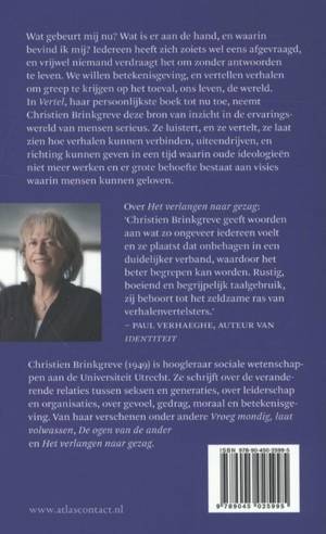 Wat gebeurt mij nu? Wat is er aan de hand, en waarin bevind ik mij? Iedereen heeft zich zoiets wel eens afgevraagd, en vrijwel niemand verdraagt het om zonder antwoorden te leven. We willen betekenisgeving, en vertellen verhalen om greep te krijgen op het toeval, ons leven, de wereld. In Vertel, haar persoonlijkste boek tot nu toe, neemt Christien Brinkgreve deze bron van inzicht in de ervaringswereld van mensen serieus. Ze luistert, en ze vertelt, ze laat zien hoe verhalen kunnen verbinden, uiteendrijven, en richting kunnen geven in een tijd waarin oude ideologieën niet meer werken en er grote behoefte bestaat aan visies waarin mensen kunnen geloven.