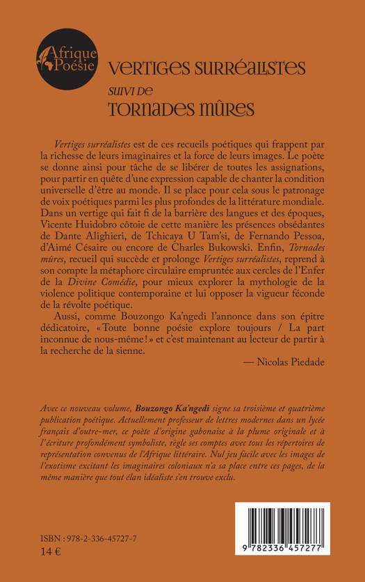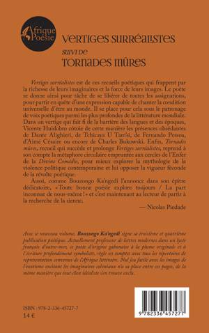 Vertiges surréalistes est de ces recueils poétiques qui frappent par la richesse de leurs imaginaires et la force de leurs images. Le poète se donne ainsi pour tâche de se libérer de toutes les assignations, pour partir en quête d'une expression capable de chanter la condition universelle d'être au monde. Il se place pour cela sous le patronage de voix poétiques parmi les plus profondes de la littérature mondiale. Dans un vertige qui fait fi de la barrière des langues et des époques, Vicente Huidobro côtoie de cette manière les présences obsédantes de Dante Alighieri, de Tchicaya U Tam'si, de Fernando Pessoa, d'Aimé Césaire ou encore de Charles Bukowski. Enfin, Tornades mûres, recueil qui succède et prolonge Vertiges surréalistes, reprend à son compte la métaphore circulaire empruntée aux cercles de l'Enfer de la Divine Comédie, pour mieux explorer la mythologie de la violence politique contemporaine et lui opposer la vigueur féconde de la révolte poétique. Aussi, comme Bouzongo Ka'ngedi l'annonce dans son épitre dédicatoire, Toute bonne poésie explore toujours / La part inconnue de nous-même ! et c'est maintenant au lecteur de partir à la recherche de la sienne. - Nicolas Piedade