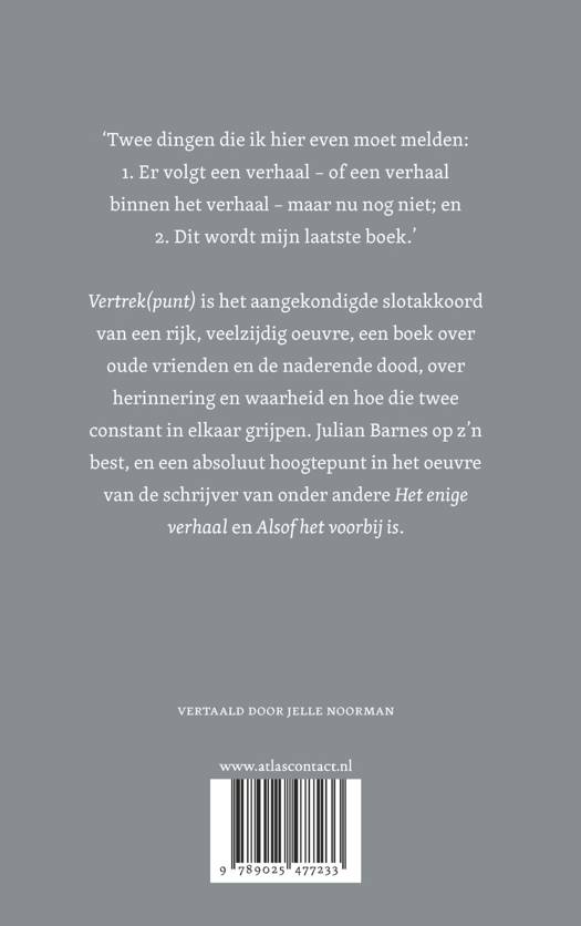 Vertrek(punt) is het aangekondigde slotakkoord van een rijk, veelzijdig oeuvre, een boek over oude vrienden en de naderende dood, over herinnering en waarheid en hoe die twee constant in elkaar grijpen. Julian Barnes op z'n best, en een absoluut hoogtepunt in het oeuvre van de schrijver van onder andere 'Het enige verhaal' en 'Alsof het voorbij is'. 'Twee dingen alvast: 1. Er komt heus een verhaal (of een verhaal binnen het verhaal), maar nog niet; en 2. Dit is mijn laatste boek.' De jeugdliefde tussen Stephen en Jean vlamt na 40 jaar weer op; Julian heeft er opnieuw een hand in. Van het een komt het ander, en vlak daarna is hij getuige op hun trouwerij. Maar hoe betrouwbaar is Julian – als vriend, als geschiedschrijver, als verteller? Het feilbare geheugen, de ongrijpbare waarheid, de manipulaties van de schrijver: Vertrek(punt) stipt bondig maar elegant de grote thema's aan van een heel (schrijvers)- leven. Een leven met een naderend einde, dat Barnes – geheel in karakter – stoïcijns probeert tegemoet te treden. En hoe het afloopt met Stephen en Jean? 'Ik vertel je de rest een andere keer.'