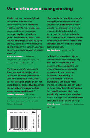 Van vertrouwen naar genezing 'Durft u het aan om afwezigheid door ziekte te benaderen vanuit vertrouwen in plaats van wantrouwen? Vertrouwen zonder voorschrift, geschreven door een expert op het gebied van gezondheid en werk, onthult een nieuwe aanpak gebaseerd op open dialoog, snelle interventie en focus op wat mensen wél kunnen, voor een gezondere werkomgeving en minder verzuim.' - Wilmar Schaufeli | emeritus hoogleraar arbeidspsychologie, KU Leuven & Universiteit Utrecht 'Vertrouwen zonder voorschrift illustreert op inzichtelijke wijze dat de manier waarop we denken over ziekte en gezondheid, maar ook het werk zelf, drastisch aan het veranderen is. Het biedt verfrissende nieuwe antwoorden op moeilijke vraagstukken op dit terrein.' - Evelien Brouwers | bijzonder hoogleraar psychische gezondheid en duurzame inzetbaarheid in arbeid, Tilburg University 'Een zinvolle job met fijne collega's draagt bij aan de levenskwaliteit van mensen. Net daarom moeten we alle inspanningen leveren om mensen die langdurig ziek zijn terug naar het werk te helpen. In Vertrouwen zonder voorschrift reikt Lode Godderis tal van interessante inzichten aan. We maken er graag samen werk van.' - Luc Van Gorp | voorzitter CM 'In België en Vlaanderen zijn er vandaag meer mensen langdurig ziek dan werkzoekend, een onaanvaardbare verspilling van menselijk en maatschappelijk potentieel. In een moderne, inclusieve samenleving is gezondheid niet louter de afwezigheid van ziekte, maar evengoed het vermogen om actief en betekenisvol deel te nemen aan het dagelijkse leven, stelt Lode terecht. Op een moment waar het beleid in België voor cruciale keuzes staat, toont dit boek ons de weg.' - Wim Adriaens | gedelegeerd bestuurder bij VDAB e