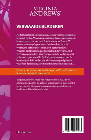 'Verwaaide bladeren' is het tweede en laatste deel in de Lente-serie van Virginia Andrews. Nadat haar familie op een dramatische wijze uiteengespat is, wordt Jordan March naar oudtante Frances gestuurd, de lang vergeten zus van haar dominante oma Emma. Zij woont in een afgelegen, vervallen boerderij en is de vreemdste persoon die Jordan ooit heeft ontmoet. Waarom heeft haar oma deze onschuldige vrouw altijd verborgen gehouden? Was Frances, net als Jordan, te snel volwassen geworden? In de donkere schaduwen van de boerderij ontdekt Jordan een allesvernietigend geheim, waardoor de familie March nooit meer dezelfde zal zijn… Lees hoe het verhaal van Jordan begon in Vertrapte bloem, het eerste boek in de Lente-serie!