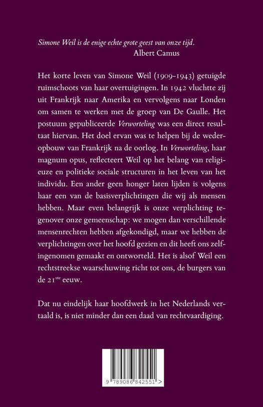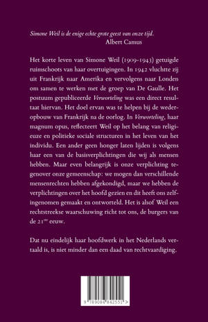 Het korte leven van Simone Weil (1909-1943) getuigde ruimschoots van haar overtuigingen. In 1942 vluchtte zij uit Frankrijk naar Amerika en vervolgens naar Londen om samen te werken met de groep van De Gaulle. Het postuum gepubliceerde Verworteling was een direct resultaat hiervan. Het doel ervan was te helpen bij de wederopbouw van Frankrijk na de oorlog. In Verworteling, haar magnum opus, reflecteert Weil op het belang van religieuze en politieke sociale structuren in het leven van het individu. Een ander geen honger laten lijden is volgens haar een van de basisverplichtingen die wij als mensen hebben. Maar even belangrijk is onze verplichting tegenover onze gemeenschap: we mogen dan verschillende mensenrechten hebben afgekondigd, maar we hebben de verplichtingen over het hoofd gezien en dit heeft ons zelfingenomen gemaakt en ontworteld. Het is alsof Weil een rechtstreekse waarschuwing richt tot ons, de burgers van de 21ste eeuw.