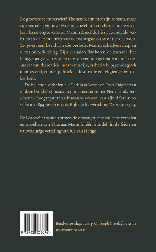 De grootste roem verwierf Thomas Mann met zijn romans, maar zijn verhalen en novellen zijn, zowel literair als op andere vlakken, haast ongeëvenaard. Mann schreef de hier gebundelde verhalen in de eerste helft van de twintigste eeuw of net daarvoor. Ze geven een beeld van die periode, Manns schrijverschap en diens ontwikkeling. Zijn verhalen flankeren de romans, het hooggebergte van zijn oeuvre, op een intrigerende manier: net anders van thematiek, maar even rijk, esthetisch, psychologisch doortastend, en met politieke, filosofische en religieuze betrokkenheid. De bekende verhalen als De dood in Venetië en Tonio Kröger staan in deze bundeling naast nog niet eerder in het Nederlands verschenen hoogtepunten uit Manns oeuvre: van zijn debuut Gevallen uit 1894 tot en met de Bijbelse hervertelling De wet uit 1944.