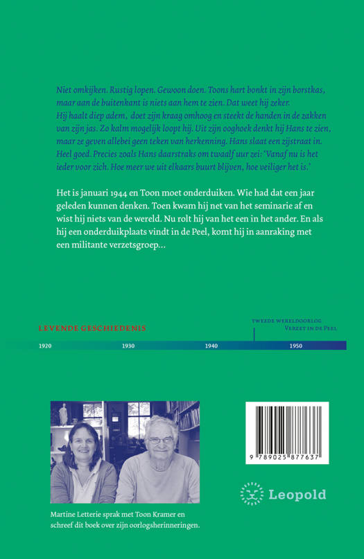 Niet omkijken. Rustig lopen. Gewoon doen. Toons hart bonkt in zijn borstkas, maar aan de buitenkant is niets aan hem te zien. Dat weet hij zeker. Hij haalt diep adem, doet zijn kraag omhoog en steekt de handen in de zakken van zijn jas. Zo kalm mogelijk loopt hij. Uit zijn ooghoek denkt hij Hans te zien, maar ze geven allebei geen teken van herkenning. Hans slaat een zijstraat in. Heel goed. Precies zoals Hans daarstraks om twaalf uur zei: ‘Vanaf nu is het ieder voor zich. Hoe meer we uit elkaars buurt blijven, hoe veiliger het is.'Het is januari 1944 en Toon moet onderduiken. Wie had dat een jaar geleden kunnen denken? Toen kwam hij net van het seminarie af en wist hij niets van de wereld. Nu rolt hij van het een in het ander. En als hij een onderduikplaats vindt in de Peel, komt hij in aanraking met een militante verzetsgroep…