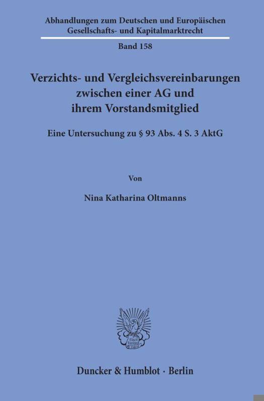 Vorstandsmitglieder haften gegenuber der AG fur pflichtwidriges Verhalten. Die Moglichkeit, von Seiten der AG auf Regressanspruche zu verzichten oder sich uber diese zu vergleichen, wird durch 93 Abs. 4 S. 3 AktG begrenzt. De lege lata ist die Zustimmung der Hauptversammlung nach Verstreichenlassen einer dreijahrigen Sperrfrist erforderlich. Die Voraussetzung der Hauptversammlungszustimmung kann negative Publizitatsauswirkungen haben. Einer deshalb geforderten Abschaffung des Zustimmungserfordernisses tritt die Arbeit entgegen. Um praxistaugliche Losungen zu ermoglichen, wird unter Heranziehung rechtsvergleichender Untersuchungsergebnisse ein alternativ anwendbares Konzept einer Gerichtszustimmung entwickelt. Dieses Modell der gerichtlichen Zustimmung soll im Einzelfall ebenfalls die dreijahrige Sperrfrist ersetzen konnen, um auch hinsichtlich der dreijahrigen Handlungssperre Alternativen zu bieten. Das ersatzlose Streichen der Sperrfrist wird hingegen abgelehnt.