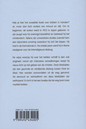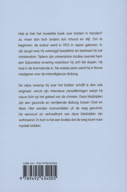 Heb je hier het zoveelste boek over bidden in handen? Ja, maar dan toch anders van inhoud en stijl. Om te beginnen: de auteur werd in 1923 in Japan geboren. In zijn jeugd was hij overtuigd boeddhist en bestreed hij het christendom. Tijdens zijn universitaire studies overviel hem een bijzondere ervaring waardoor hij zich liet dopen. Hij trad in de Karmelorde in. Na enkele jaren werd hij in Rome raadgever voor de interreligieuze dialoog. De wijze waarop hij over het bidden schrijft is dan ook origineel: vanuit zijn intensieve zenoefeningen werpt hij nieuw licht op het gebed van de christen. Deze bladzijden zijn een gezonde en verrijkende dialoog tussen Oost en West. Hier worden vooroordelen uit de weg geruimd. De eenvoud en verhaaltrant van deze bladzijden zijn verfrissend. En toch is het een boekje dat de weg toont naar mystiek bidden.