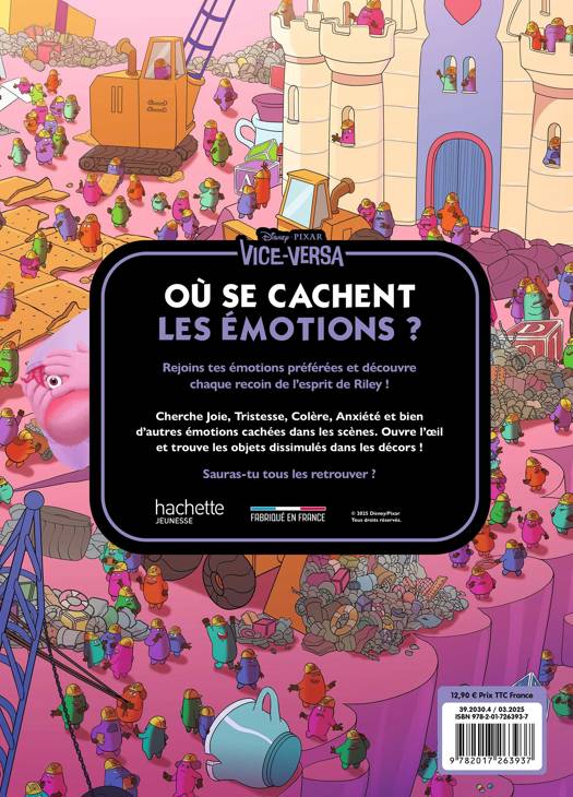 Des illustrations qui fourmillent de détails pour s’amuser à retrouver Joie, Anxiété, Dégoût et les autres personnages de Vice-Versa, mais aussi de nombreux éléments cachés dans les décors !