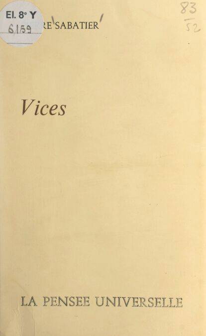 Pierre Sabatier a été un des premiers à se pencher sur le problème douloureux des êtres victimes de complexes qui régissent toute leur vie, pour leur propre malheur, et pour celui des êtres qu’ils approchent et qui s’attachent à eux. Pierre Sabatier, évitant toute pornographie facile, a voulu conserver un ton très objectif, se défendant de toute contestation. Il raconte, il expose. En rééditant Vices, roman des Années folles, c’est un roman de tous les temps que nous livrons au public car, de tout temps, il y a eu des anormaux et il y en aura toujours. Une intrigue attachante, une histoire d’amour. Oui, une histoire d’amour émouvante, des héros malgré tout sympathiques et terriblement modernes. Pierre Sabatier, après avoir débuté dans la littérature par d’importants ouvrages, l’un sur l’« Esthétique des Goncourt » — deux fois couronné par l’Académie française et récemment réédité — et l’autre sur une « Esquisse de la morale de Stendhal », a fait une double carrière d’auteur dramatique et de romancier. Ses principaux romans sont : « La révoltée », « Judith » (desquels on a tiré deux films), « La comédie du mariage », « Le chemin de Cythère ». Ses principales pièces : « Le démon de la chair », « L’amour à la blague », « Business », « Ces dames » avec Charles Oulmont, « Tu ne m’échapperas jamais » d’après Margareth Kennedy, « Félicity » d’après Noël Coward, « Agnès Bernauer » de Hebbel, « Faust », « Egmont » d’après Goethe, etc. et « Agnès » d’après Max Frisch prochainement en répétition, une adaptation du « Marchand de Venise » en collaboration avec Thierry Maulnier, de l’Académie française.