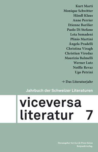 In Viceversa Literatur 7. Jahrbuch der Schweizer Literaturen unterhält sich Guy Krneta mit dem 'Multiversum' Kurt Marti, sprechen Händl Klaus und Monique Schwitter über Literatur und Theater, würdigt eine Hommage die große Westschweizer Lyrikerin Anne Perrier, denkt Étienne Barilier über Kunst und Sprache nach, erzählt Paolo Di Stefano von sizilianischen Wurzeln, Tessiner Erinnerungen und italienischen Lebenswelten und gibt die Engadiner Autorin Leta Semadeni Einblick in die zweisprachige Wortlandschaft. 'Zu Gast' sind Plinio Martini aus dem Maggiatal und die Argentinierin Ángela Pradelli.
