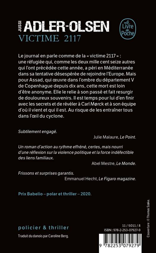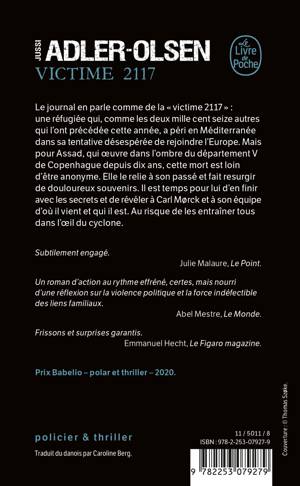 Le journal en parle comme de la « victime 2117 » : une réfugiée qui, comme les deux mille cent seize autres qui l’ont précédée cette année, a péri en Méditerranée dans sa tentative désespérée de rejoindre l’Europe. Mais pour Assad, qui œuvre dans l’ombre du département V de Copenhague depuis dix ans, cette mort est loin d’être anonyme. Elle le relie à son passé et fait resurgir de douloureux souvenirs. Il est temps pour lui d’en finir avec les secrets et de révéler à Carl Mørck et à son équipe d’où il vient et qui il est. Au risque de les entraîner tous dans l’œil du cyclone.
