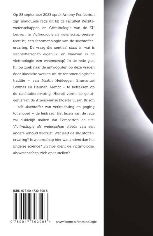 Op 28 september 2023 sprak Antony Pemberton zijn inaugurele rede uit bij de Faculteit Rechtswetenschappen en Criminologie van de KU Leuven. In Victimologie als wetenschap presenteert hij een fenomenologie van de slachtofferervaring. De vraag die centraal staat is: wat is slachtofferschap eigenlijk, en waarvan is de victimologie een wetenschap? In de rede gaat hij op zoek naar de antwoorden op deze vragen door klassieke werken uit de fenomenologische traditie – van Martin Heidegger, Emmanuel Levinas en Hannah Arendt – te betrekken op de slachtofferervaring. Hierbij vormt de getuigenis van de Amerikaanse filosofe Susan Brison – zelf slachtoffer van verkrachting en poging tot moord – de leidraad. Het lezen van de rede zal duidelijk maken dat Pemberton de titel Victimologie als wetenschap steeds van een andere inhoud voorziet. Wat leert de slachtofferervaring? Is wetenschap hier wat anders dan het Engelse science? En hoe dient de victimologie, als wetenschap, zich op te stellen?