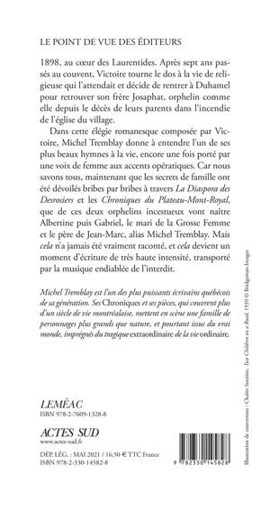 1898, au coeur des Laurentides. Après sept années passées au couvent, Victoire tourne le dos à la vie de religieuse qui l'attendait et décide de rentrer à Duhamel pour retrouver son frère Josaphat, orphelin comme elle depuis le décès de leurs parents dans l'incendie de l'église du village. Dans cette élégie romanesque composée par Victoire, Michel Tremblay donne à entendre l'un de ses plus beaux hymnes à la vie, encore une fois porté par une voix de femme aux accents opératiques. Aux sources de la grande saga des Desrosiers (des heures et des heures de lecture aussi cosy que secouante), avec cette histoire exaltée d'un amour interdit, Michel Tremblay livre pour la toute première fois la « genèse de la genèse » de sa monumentale entreprise romanesque.