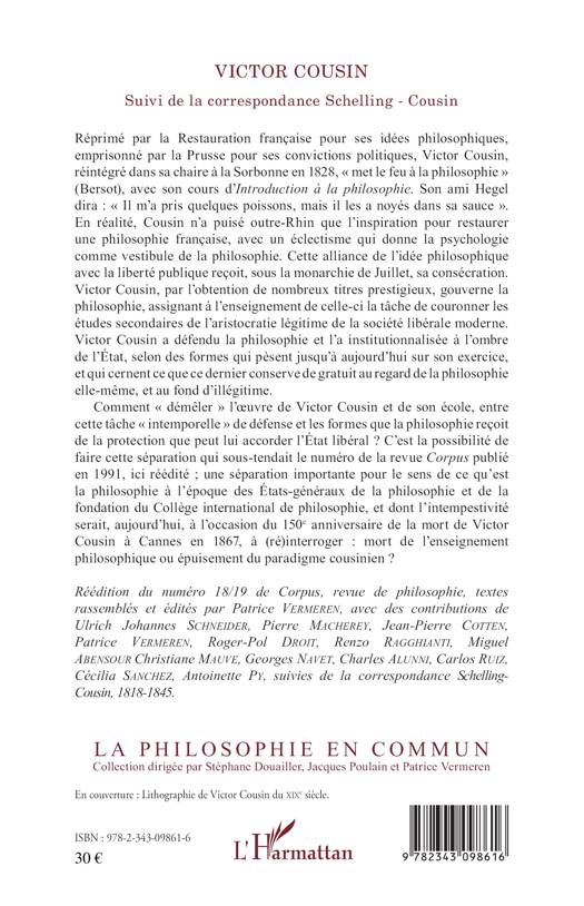 Emprisonné par la Prusse pour ses convictions politiques, réprimé par la Restauration française pour ses idées politiques, Victor Cousin (1792-1867) est surtout connu pour avoir "(mis) le feu à la philosophie". En puisant dans la philosophie allemande le nécessaire pour revitaliser une pensée française fossilisée, il s'imposera comme le philosophe la monarchie de Juillet. Étroitement liée à l'État, son oeuvre pose un grand nombre de problèmes, de légitimité notamment, que la revue Corpus , en 1991, s'était essayée à résoudre. A la veille du 150ème anniversaire de sa mort, cette réédition est bienvenue.