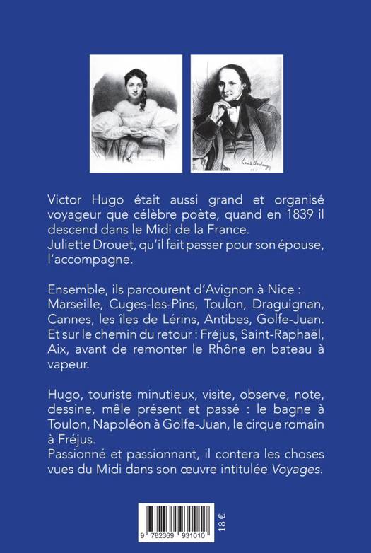 Victor Hugo était aussi grand et organisé voyageur que célèbre poète, quand en 1839 il descend dans le Midi de la France. Juliette Drouet, qu’il fait passer pour son épouse, l’accompagne. Ensemble, ils parcourent d’Avignon à Nice : Marseille, Cuges-les-Pins, Toulon, Draguignan, Cannes, les îles de Lérins, Antibes, Golfe-Juan. Et sur le chemin du retour : Fréjus, Saint-Raphaël, Aix, avant de remonter le Rhône en bateau à vapeur. Hugo, touriste minutieux, visite, observe, note, dessine, mêle présent et passé : le bagne à Toulon, Napoléon à Golfe-Juan, le cirque romain à Fréjus. Passionné et passionnant, il contera les choses vues du Midi dans son oeuvre intitulée Voyages.
