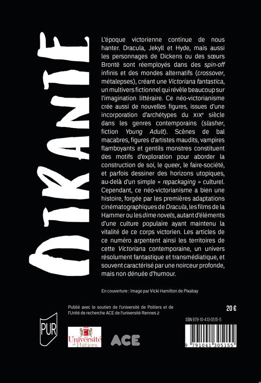 L’époque victorienne continue de nous hanter. Dracula, Jekyll et Hyde, mais aussi les personnages de Dickens ou des soeurs Brontë sont réemployés dans des spin-off infinis et des mondes alternatifs (crossover, métalepses), créant une Victoriana fantastica, un multivers fictionnel qui révèle beaucoup sur l’imagination littéraire. Ce néo-victorianisme crée aussi de nouvelles figures, issues d’une incorporation d’archétypes du XIXe siècle dans les genres contemporains (slasher, fiction Young Adult). Scènes de bal macabres, figures d’artistes maudits, vampires flamboyants et gentils monstres constituent des motifs d’exploration pour aborder la construction de soi, le queer, le faire-société, et parfois dessiner des horizons utopiques, au-delà d’un simple « repackaging » culturel. Cependant, ce néo-victorianisme a bien une histoire, forgée par les premières adaptations cinématographiques de Dracula, les films de la Hammer ou les dime novels, autant d’éléments d’une culture populaire ayant maintenu la vitalité de ce corps victorien. Les articles de ce numéro arpentent ainsi les territoires de cette Victoriana contemporaine, un univers résolument fantastique et transmédiatique, et souvent caractérisé par une noirceur profonde, mais non dénuée d’humour.