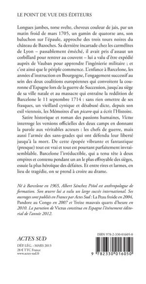 Satire historique et roman des passions humaines, «Victus» interroge les versions officielles des deux camps en donnant la parole aux véritables acteurs : les chefs de guerre, mais aussi l'armée des sans-grades qui ont défendu leur liberté jusqu'à la mort. De cette épopée vibrante et fantastique (presque) tout est vrai et tout est pourtant parfaitement invraisemblable. Barcelone l'irréductible, qui a tenu tête à deux empires et contenu pendant un an le plus effroyable des sièges, essuie la plus héroïque des défaites. Et entre rires et larmes, en lieu de tragédie, on se prend à croire au drame.