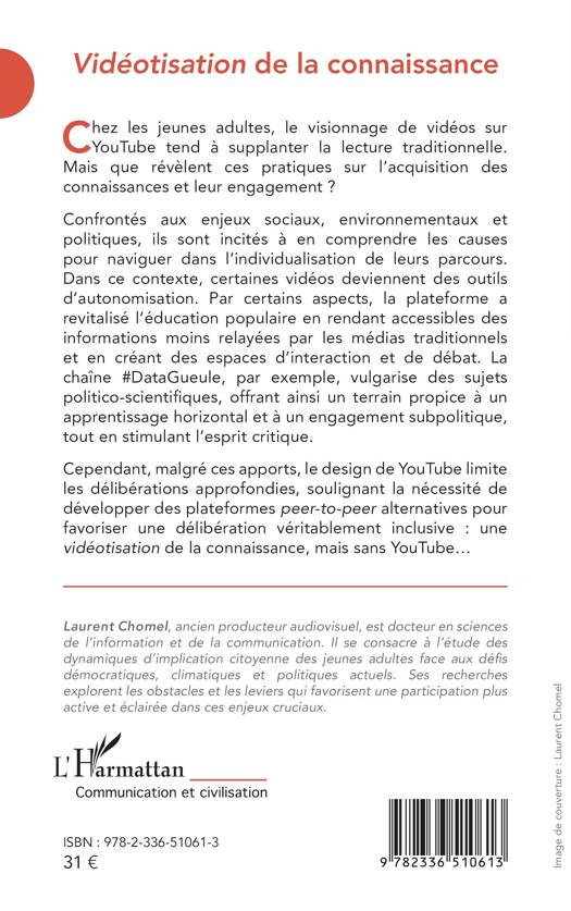 Chez les jeunes adultes, le visionnage de vidéos sur YouTube tend à supplanter la lecture traditionnelle. Mais que révèlent ces pratiques sur l'acquisition des connaissances et leur engagement ? Confrontés aux enjeux sociaux, environnementaux et politiques, ils sont incités à en comprendre les causes pour naviguer dans l'individualisation de leurs parcours. Dans ce contexte, certaines vidéos deviennent des outils d'autonomisation. Par certains aspects, la plateforme a revitalisé l'éducation populaire en rendant accessibles des informations moins relayées par les médias traditionnels et en créant des espaces d'interaction et de débat. La chaîne #DataGueule, par exemple, vulgarise des sujets politico-scientifiques, offrant ainsi un terrain propice à un apprentissage horizontal et à un engagement subpolitique, tout en stimulant l'esprit critique. Cependant, malgré ces apports, le design de YouTube limite les délibérations approfondies, soulignant la nécessité de développer des plateformes peer-to-peer alternatives pour favoriser une délibération véritablement inclusive: une vidéotisation de la connaissance, mais sans YouTube...