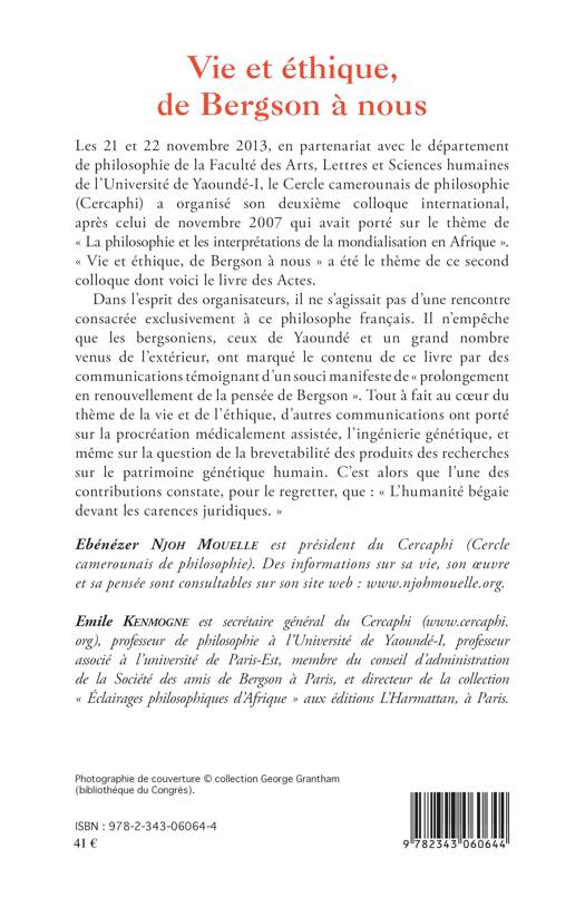 Voici les actes du colloque du Cercle camerounais de philosophie l'Université de Yaoundé I, "Vie et éthique de Bergson à nous". Les contributeurs ont marqué le contenu de ce livre par des communications témoignant d'un souci manifeste de "prolongement en renouvellement de la pensée de Bergson". Tout à fait au coeur du thème de la vie et de l'éthique, d'autres communications ont porté sur la procréation médicalement assistée, l'ingénierie génétique et même sur la question de la brevetabilité des produits de recherches sur le patrimoine génétique humain.