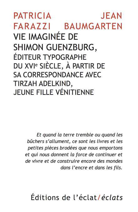 La traduction du Livre des Coutumes de Shimon Guenzburg nous fait découvrir un personnage riche en couleurs et qui a fait partie des ces individus qui, contre vents et marées, a permis que survive grâce au livre un judaïsme en proie à l'exil et aux persécutions et une langue: le yiddish. Qu'est-ce qui fait qu'en temps de crise, des individus se consacrent à coucher sur le papier les coutumes d'une communauté qui risque de disparaître? On sait peu de choses de ce Guenzburg, mais son action est d'importance. Comment la raconter? Sous la forme d'un échange imaginaire de lettres entre lui et une jeune fille vénitienne curieuse et facétieuse, Baumgarten et Farazzi ont voulu en écrire une vie imaginée et décrire ce qu'a pu être l'effervescence de l'imprimerie en hébreu à Venise au XVIe siècle.