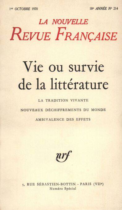 Nouveaux déchiffrements du monde : Serge Doubrovsky, La crise de la critique française Yvon Belaval, Psychanalyse et critique littéraire en France Anne Fabre-Luce, L'aventure de l'aristarque ou Le critique littéraire devant les sciences humaines Manuel de Diéguez, L'avenir des structuralismes Thomas Ferenczi, Structures linguistiques et fonction littéraire Tzvetan Todorov, Comment lire? Bernard Pingaud, L'écriture et la cure Marthe Robert, Le Jeûneur et la Panthère