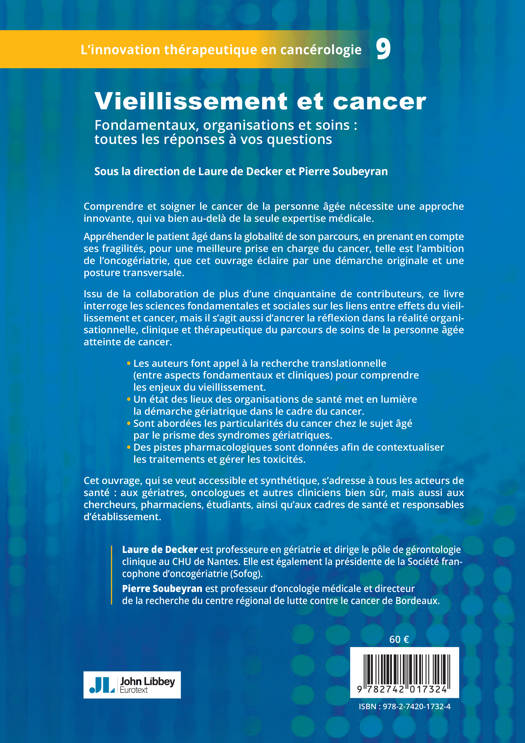 Cet ouvrage, qui se veut accessible et synthétique, s’adresse à tous les acteurs de santé : aux gériatres, oncologues et autres cliniciens bien sûr, mais aussi aux chercheurs, pharmaciens, étudiants, ainsi qu’aux cadres de santé et responsables d’établissement.