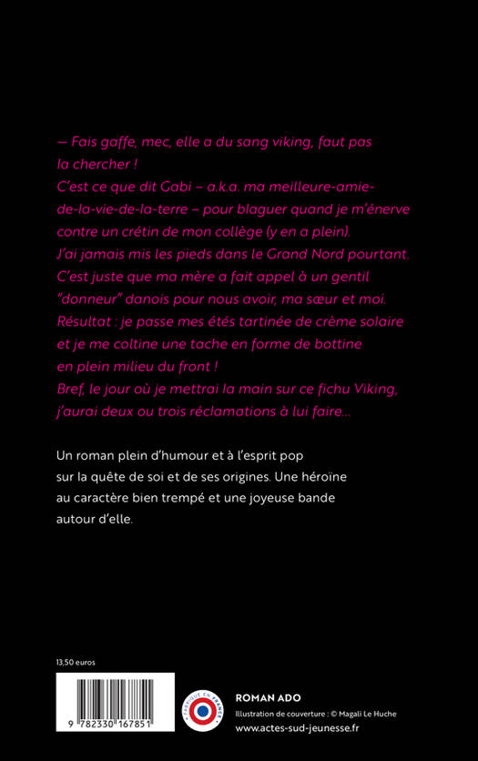 — Fais gaffe, mec, elle a du sang viking, faut pas la chercher ! C'est ce que dit Gabi - a.k.a. ma meilleure-amie de-la-vie-de-la- terre - pour blaguer quand je m'énerve contre un crétin de mon collège (y en a plein). J'ai jamais mis les pieds dans le Grand Nord pourtant. C'est juste que ma mère a fait appel à un gentil "donneur" danois pour nous avoir, ma soeur et moi. Résultat : je passe mes étés tartinée de crème solaire et je me coltine une tache en forme de bottine en plein milieu du front ! Bref, le jour où je mettrai la main sur ce fichu Viking, j'aurai deux ou trois réclamations à lui faire...