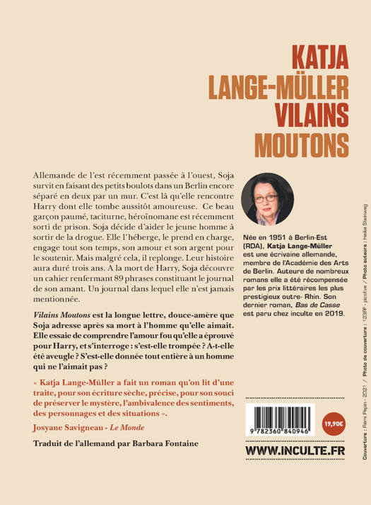 A la mort d'Harry, l'homme qu'elle aimait, Soja, Berlinoise de l'est récemment passée à l'ouest, découvre un cahier renfermant 89 phrases. Le journal de son amant. Soja, 39 ans, a fui Berlin-Est, survécu en faisant des petits boulots et un jour, rencontré un beau jeune homme paumé, taciturne, héroïnomane récemment sorti de prison. Soja tombe amoureuse immédiatement du jeune ombrageux. Elle l'héberge, le prend en charge, engage tout son temps, son amour et son argent pour l'aider à s'en sortir et le soutient dans sa thérapie de désintoxication et resocialisation. Malgré son aide, il replonge dans la drogue, son état se dégrade rapidement et c'est finalement dans son agonie que Soja l'accompagne, pratiquement jusqu'à sa mort. Leur histoire aura duré trois ans. Vilains Moutons est une longue lettre que Soja adresse à son amant après sa mort. Si elle essaie de comprendre cet amour fou qu'elle a éprouvé pour Harry, elle tâche surtout de comprendre pourquoi elle n'est mentionnée dans aucune des 89 phrases qui constituent le journal intime de l'homme qu'elle aimait tant. S'est-elle trompée, a-t-elle été aveugle ? S'est-elle donnée tout entière à un homme qui ne l'aimait pas ? La question est ouverte, et finalement la réponse importe peu à Soja, car Harry est l'homme qu'il lui fallait pour donner un sens à sa vie.